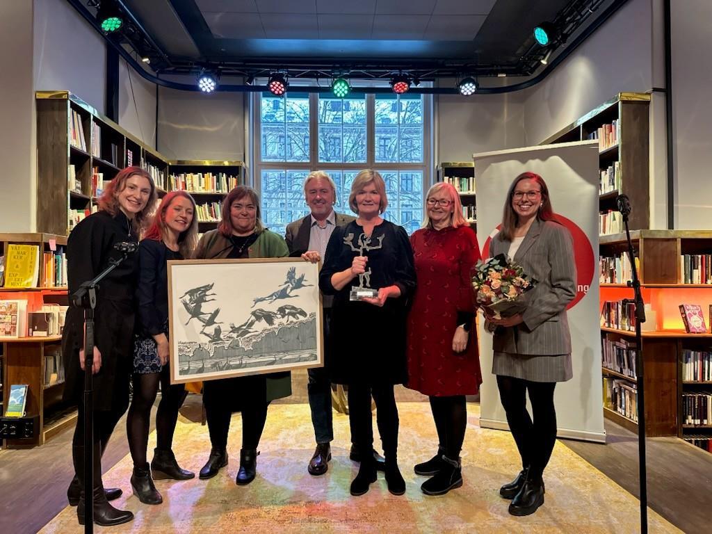 Frå høgre, dei tilsette ved biblioteket i Skjåk, Ida Marie Banken, Laila Rusten, Sigrun Eide (leiar). Ivar Bø (kommunedirektør), Marianne Stensgård (kulturkonsulent). Helene Voldner, leiar i Norsk bibliotekforening og juryleiar, og prisutdelar stortingsrepresentant Sunniva Holmås Eidsvoll(SV).
